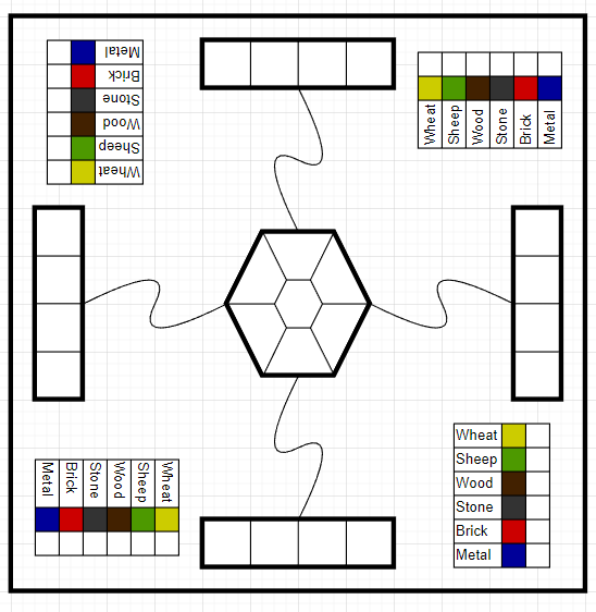 Initially I considered making a hexagon tile board where you started off with basic recourses and through trade you would gather enough resources to build more advanced buildings.