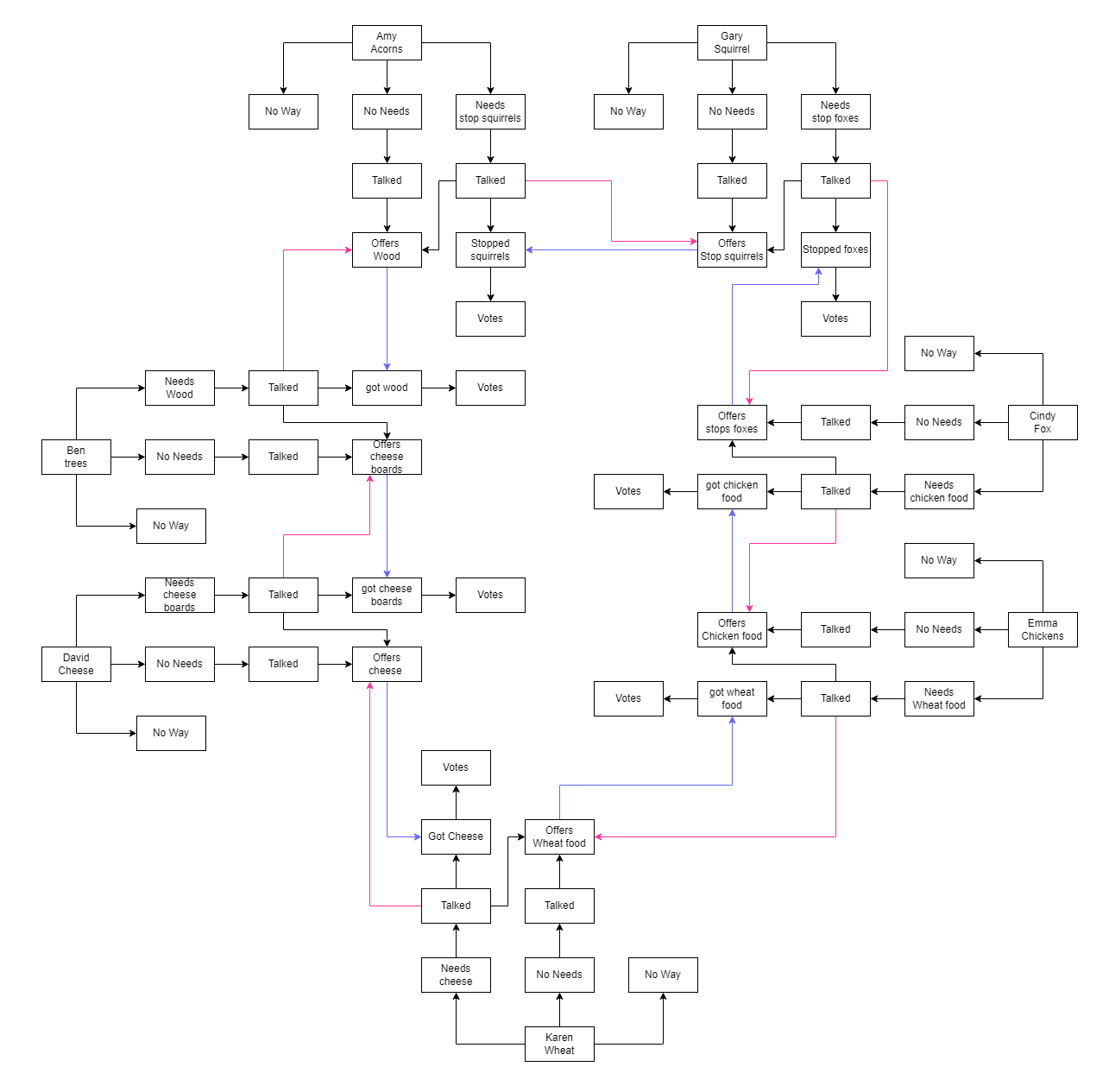 As this is a prototype the game comprises a limited set of choices that form a loop with every NPC wanting something from another NPC.