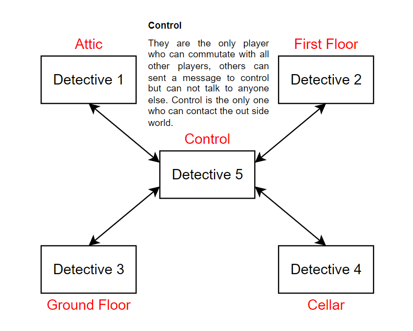 The first idea would have the players, play as the detectives, but are unable interact with one and another. they can only contact Control who can contact the other players with information etc. It will not be possible to solve the case alone so the players will need to work together.