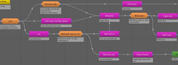 Another area I find is important is giving the player a feeling that it is up to them how things progress. I want players to feel their choices matter. The first time I explored this was in a solo project for my first year, I made a branching story where the player actions gave you points based on their moral choices. At the end of the game, you would be rated based on your final score. A plus score meant you achieved the good ending, a minus score meant you got the bad ending, and a score of zero meant you got the neutral ending. Download it below.